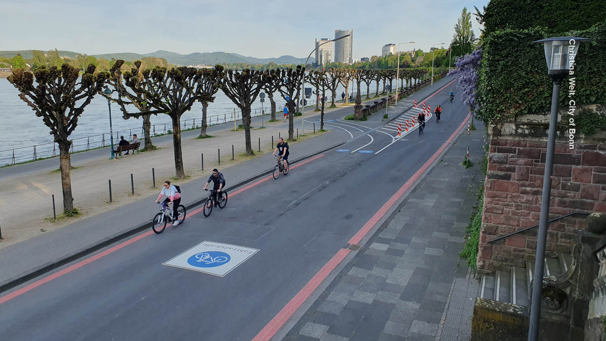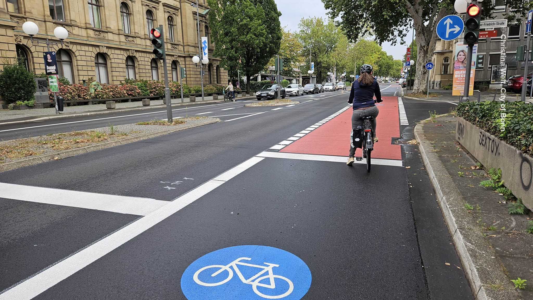 Bonn’s cycling network is transitioning from fragmented, paint-only lanes to a more coherent, protected network. Currently, 20% of Bonn’s streets are equipped with protected bicycle tracks, and more than half of streets run at 30 km/h. Until recently, bicyclists relied on unprotected, painted lanes, and tracks often with little separation from pedestrians; mergers onto sidewalks and into general traffic left gaps in comfort and safety. Today, the city is adopting new standards beginning with the North-South and East-West axes, using a mix of solutions – some better than others: wider painted bicycle lanes, some protected cycle tracks, ‘environmental lanes’ reserved for buses and bikes, and designated “Fahrradstraße”. Although these new ‘environmental lanes’ and “Fahrradstraße” are bicycle-first streets supported by clear signage, motorists nevertheless drive alongside unprotected cyclists. In a city still relatively car-dependent, this can compromise cyclist safety.
