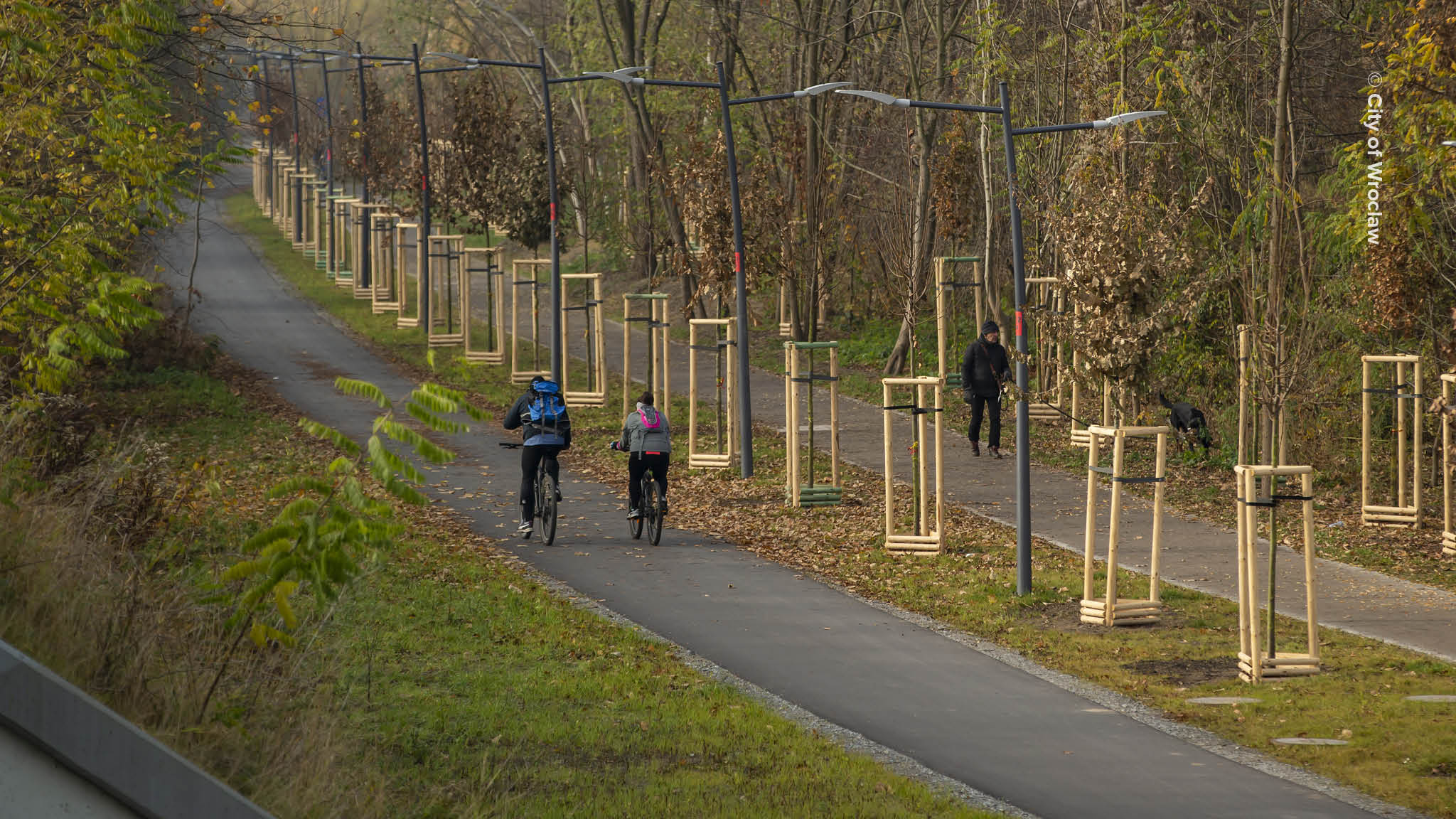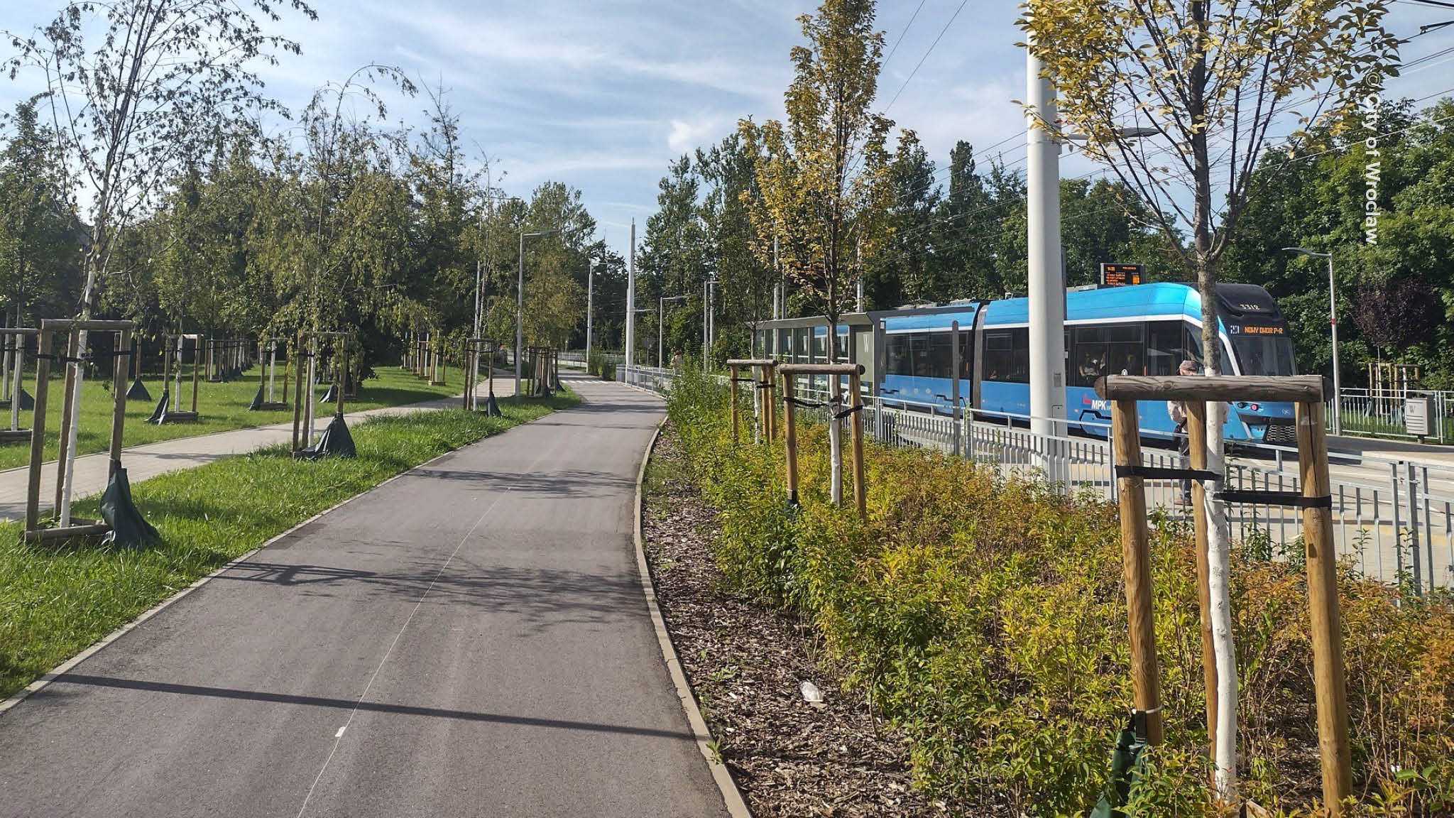 Wrocław’s extensive bicycle network – framed by the region’s Dutch-inspired cycling design guidelines – has equipped residents with 428 km of cycling routes which have successfully linked parks, universities, and business centers. Although the network has certainly excelled in quantity, the quality of the cycling infrastructure still varies: for instance, many links consist of just painted lanes or narrow 2–2.5 m bidirectional strips close to motorized traffic, which explains the modest and slipping bike share. Today, cyclists make up 5% of daily traffic, a slight decrease from the 6.3% in 2019. Recent projects are raising the bar, notably the new bicycle tracks alongside streetcar corridors, which demonstrate improved width, placement, and separation as well as a hint at the city-wide adoption of more comfortable, coherent and safe standards.